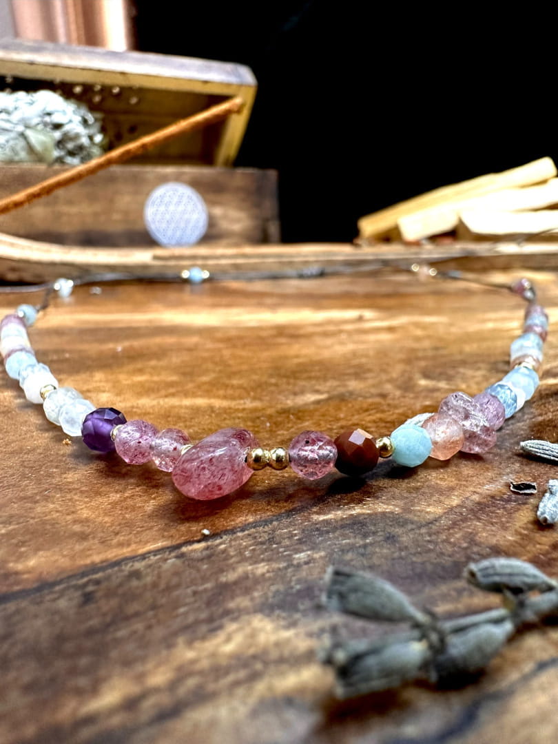 Naszyjnik jest robione ręcznie i stworzony z naturalnych kamieni dzięki czemu nie ma dwóch takich samych sztuk. Układ kamieni, pozostałych elementów czy kolorystyka będą się od siebie różniły.
