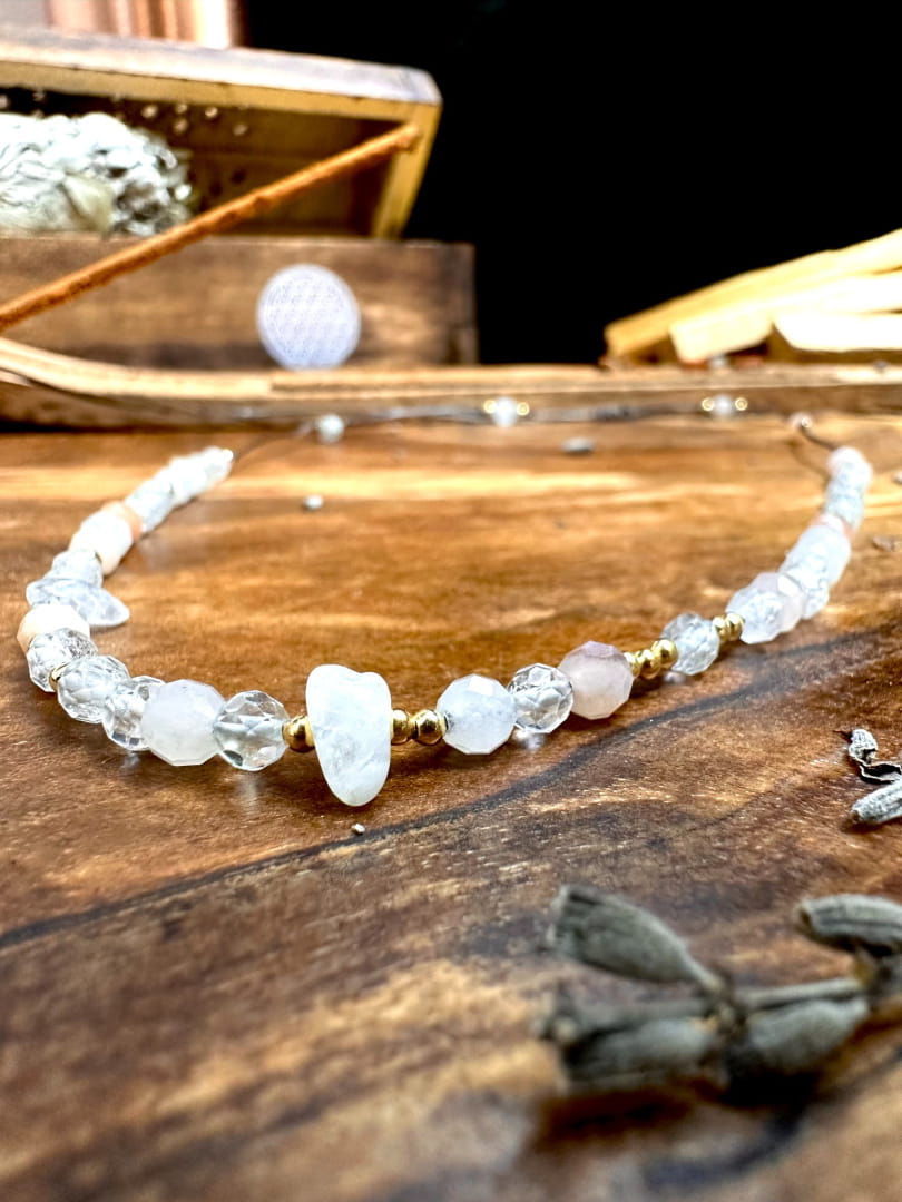 Naszyjnik jest robione ręcznie i stworzony z naturalnych kamieni dzięki czemu nie ma dwóch takich samych sztuk. Układ kamieni, pozostałych elementów czy kolorystyka będą się od siebie różniły.