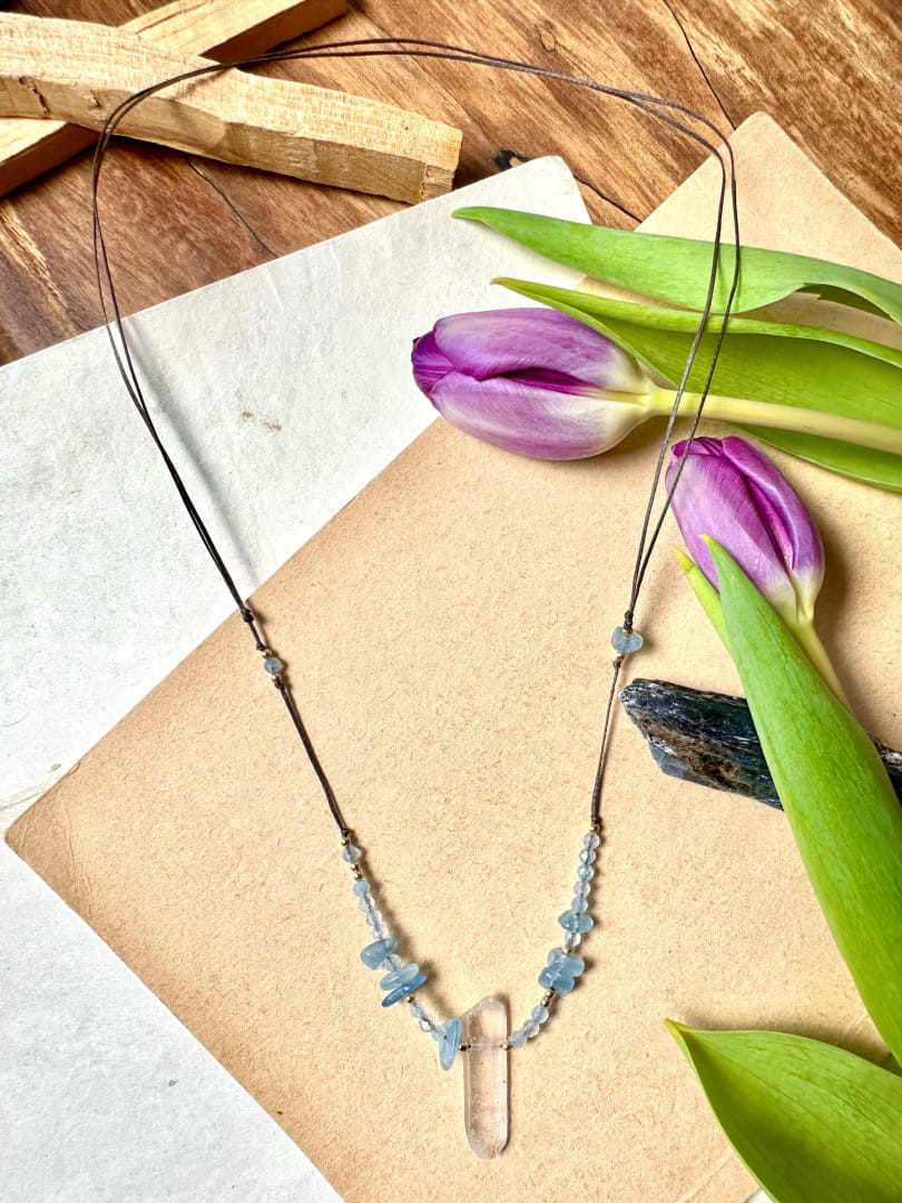 Naszyjnik amulet ręcznie wykonany z AKWAMARYNU i KRYSZTAŁU GÓRSKIEGO.