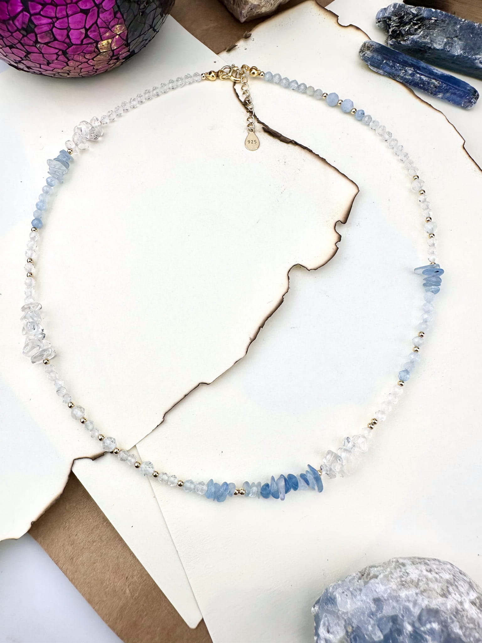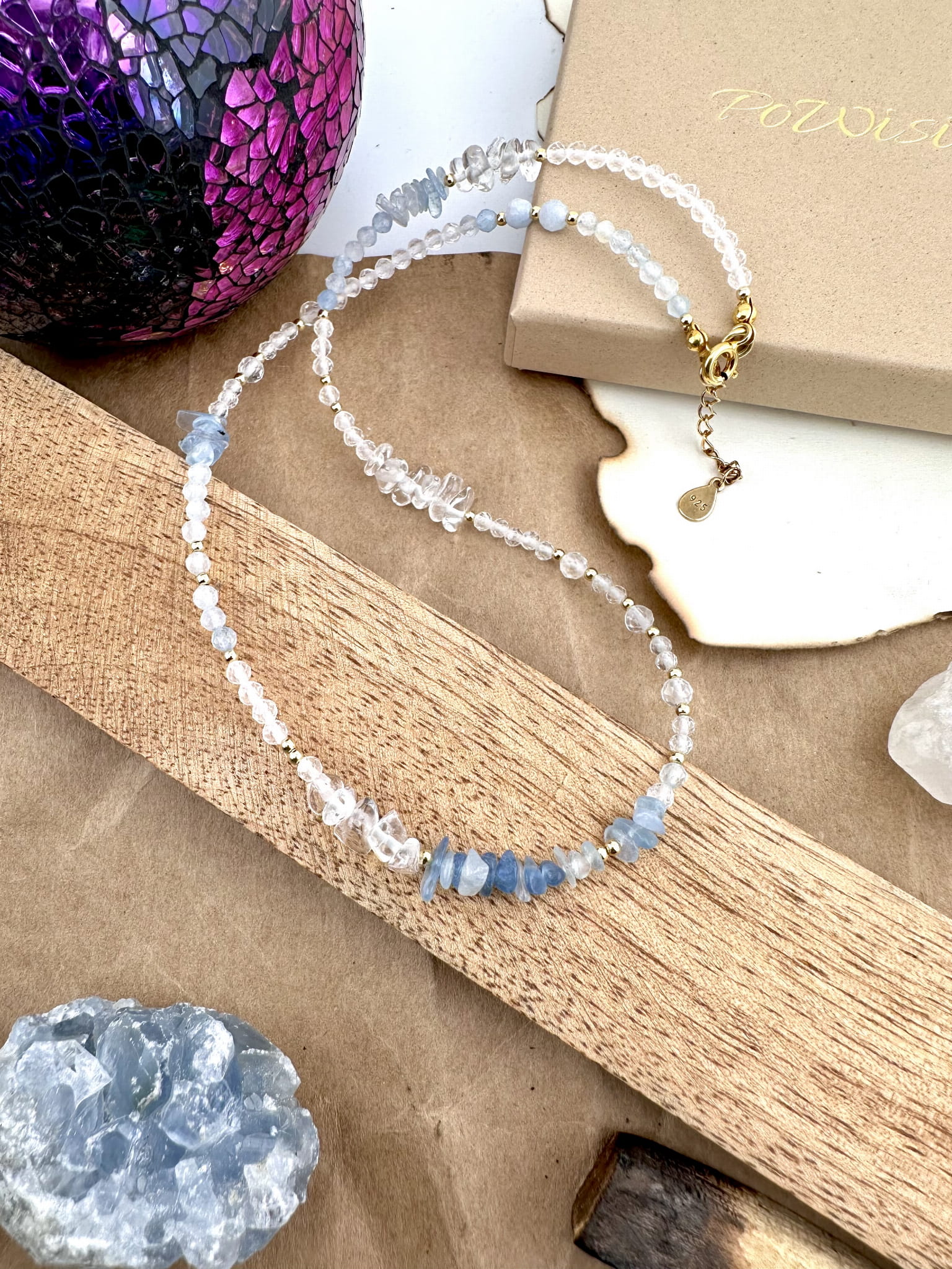 srebro próby 925 pokryte 18k złotem, kamienie naturalne fasetowane 3-8mm, żyłka jubilerska.