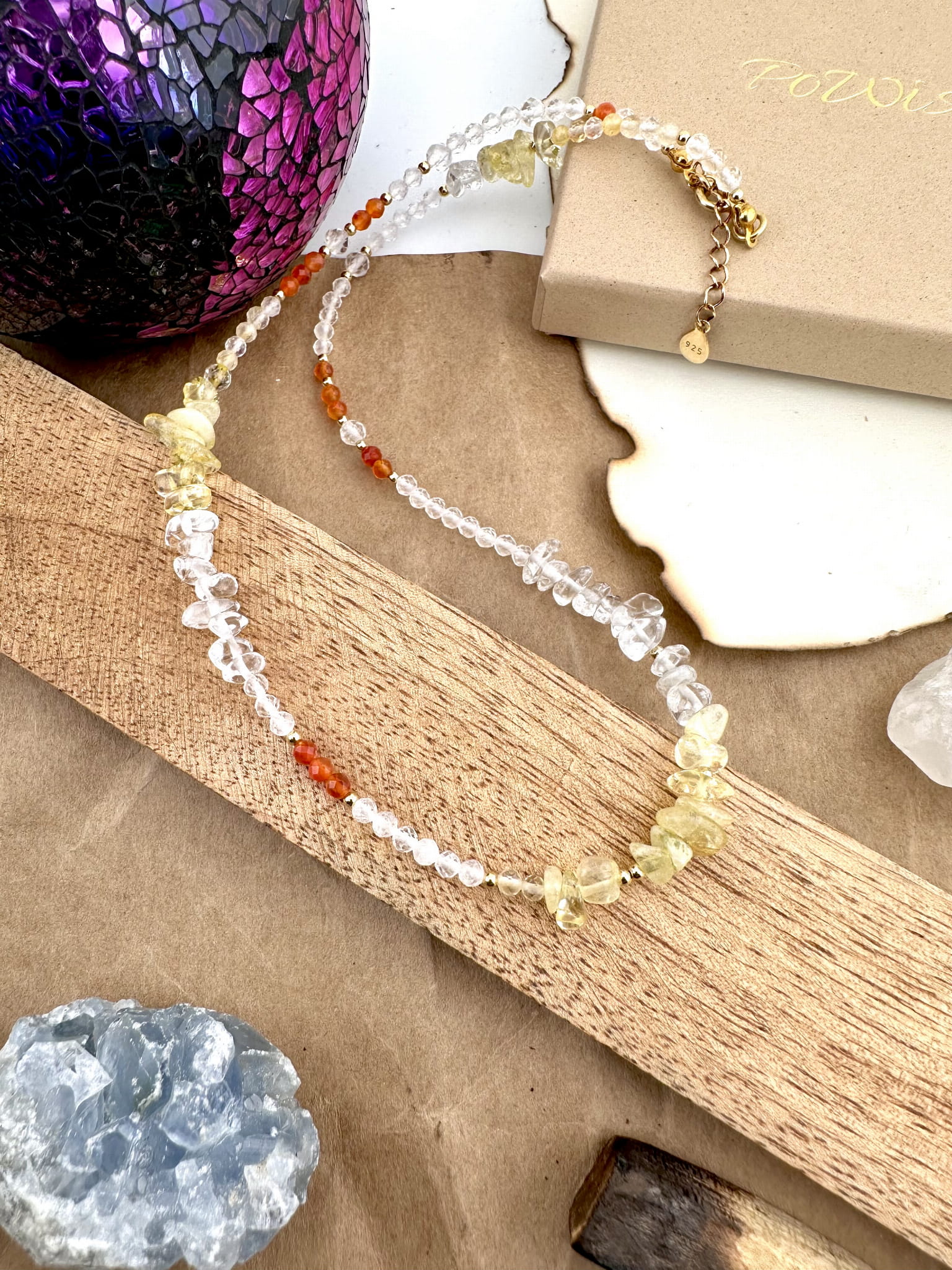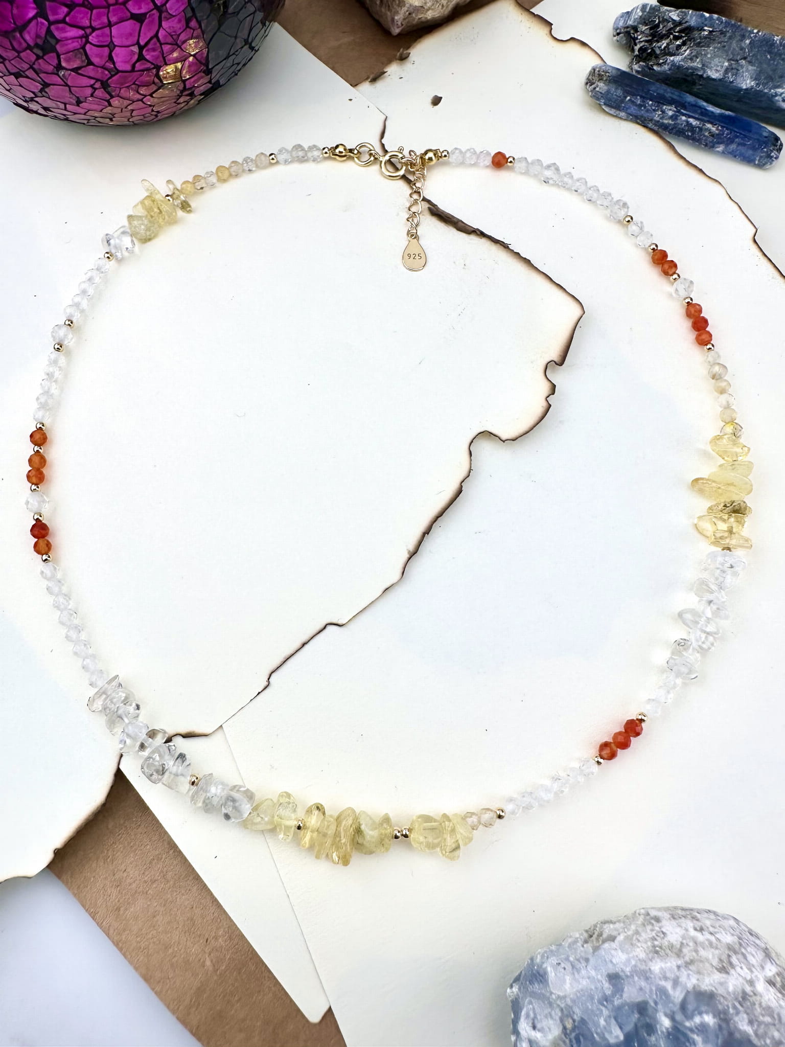 srebro próby 925 pokryte 18k złotem, kamienie naturalne fasetowane 3-8mm, żyłka jubilerska.