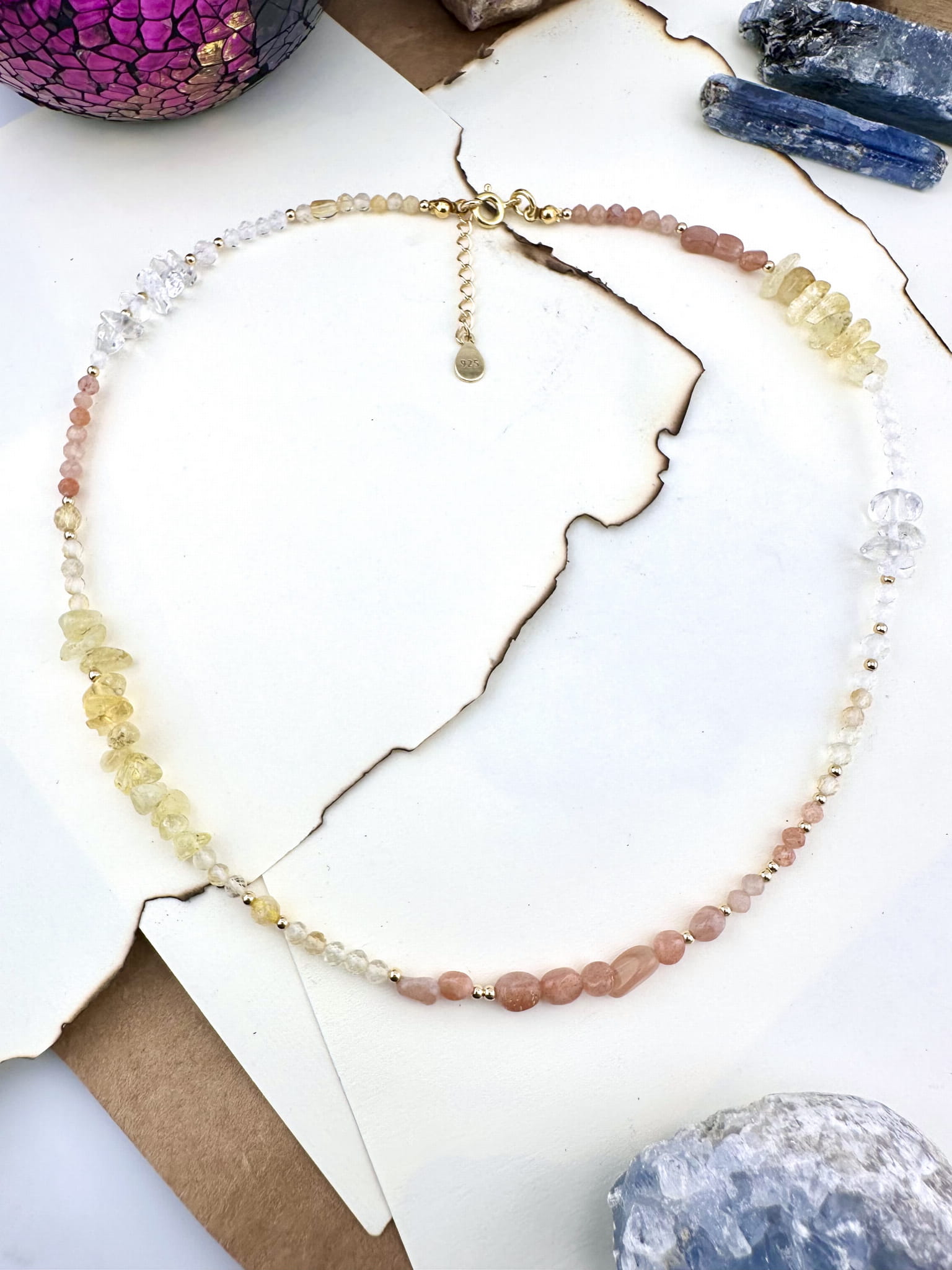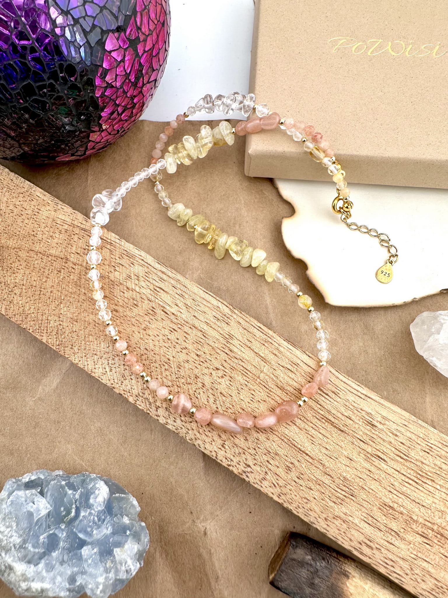 srebro próby 925 pokryte 18k złotem, kamienie naturalne fasetowane 3-8mm, żyłka jubilerska.