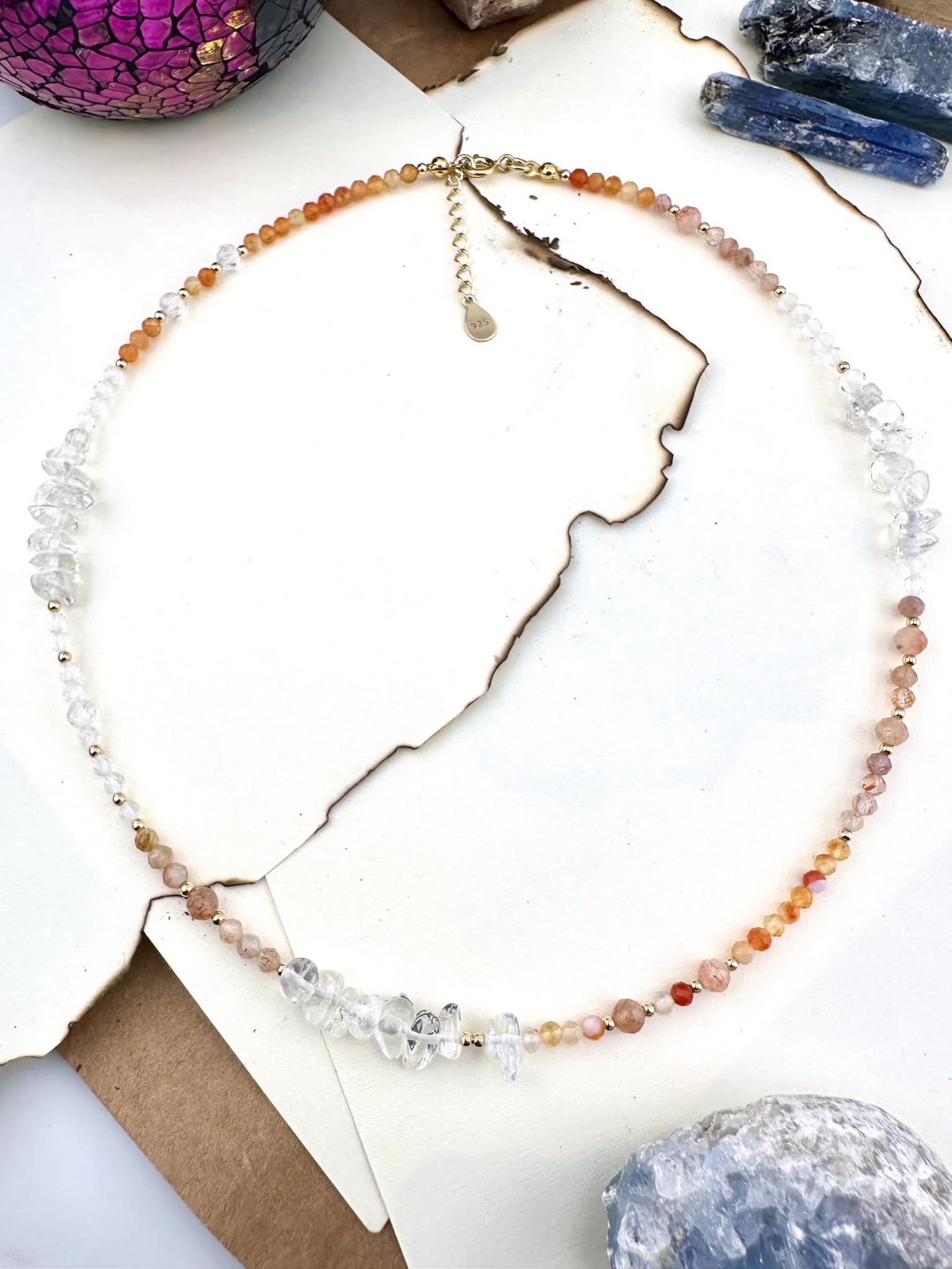 srebro próby 925 pokryte 18k złotem, kamienie naturalne fasetowane 3-8mm, żyłka jubilerska.