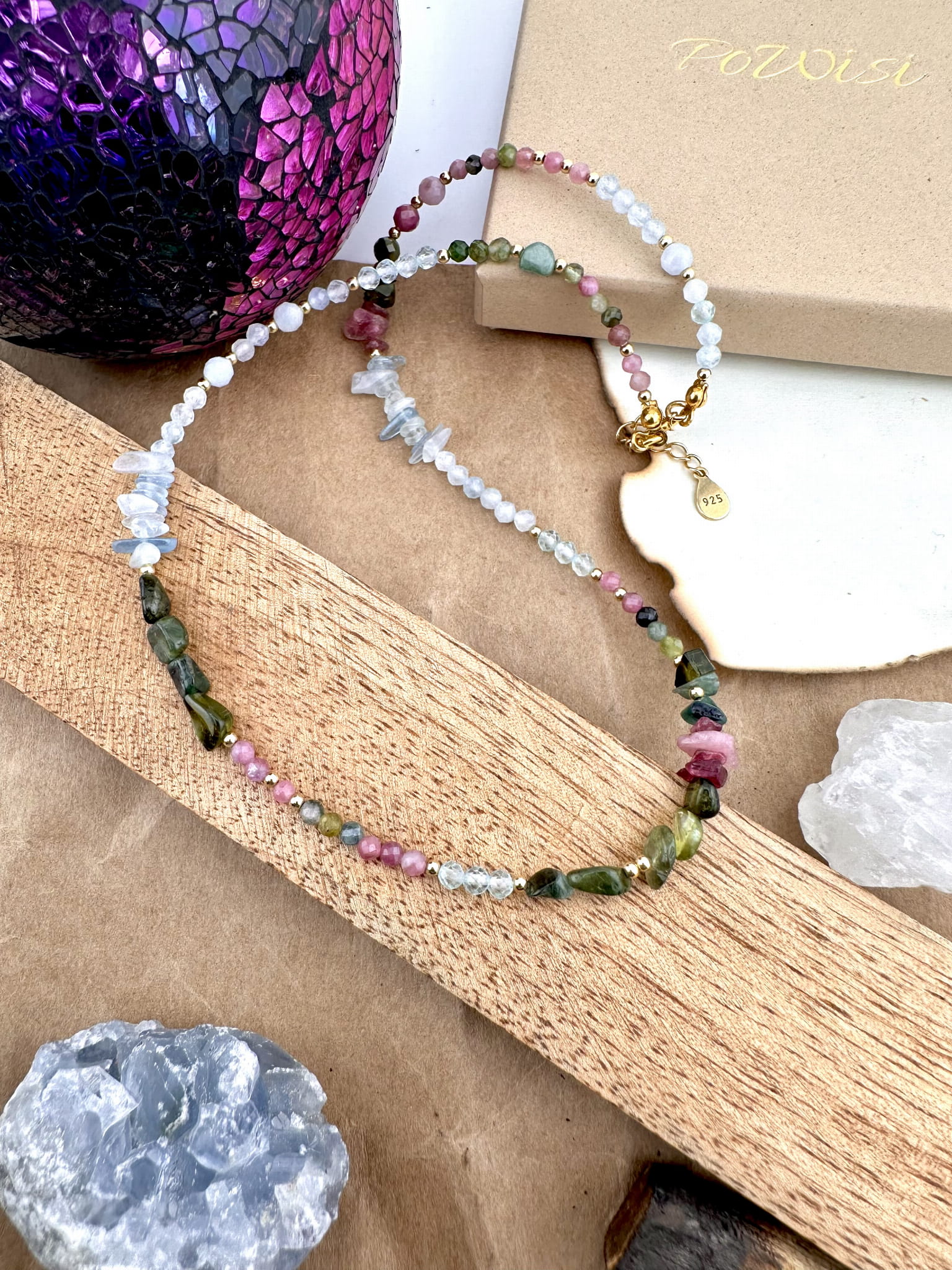 srebro próby 925 pokryte 18k złotem, kamienie naturalne fasetowane 3-8mm, żyłka jubilerska.